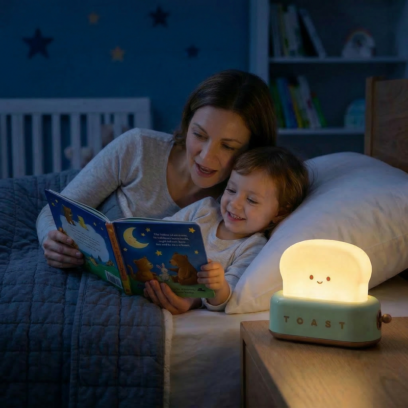 La veilleuse Mon compagnon de nuit transforme la chambre en véritable cocon. Son design toast kawaii et sa lumière douce créent une ambiance rassurante parfaite pour les routines du soir, les réveils nocturnes et les moments calmes avant de dormir.